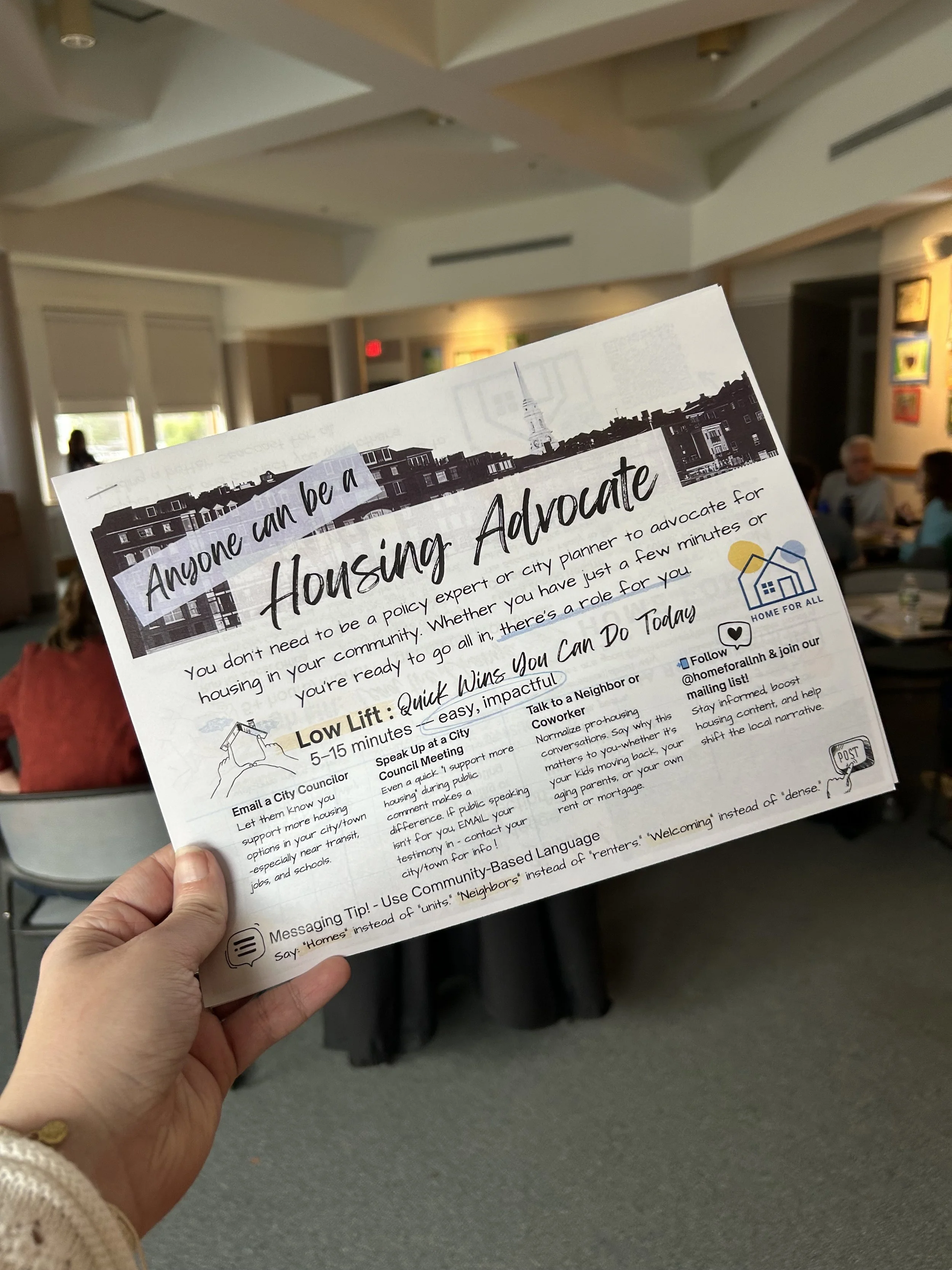 We convene, educate and mobilize community members across Rockingham, Strafford and Work counties to champion key housing projects and influence local policies that prioritize housing stability and expand deeply affordable housing opportunities.